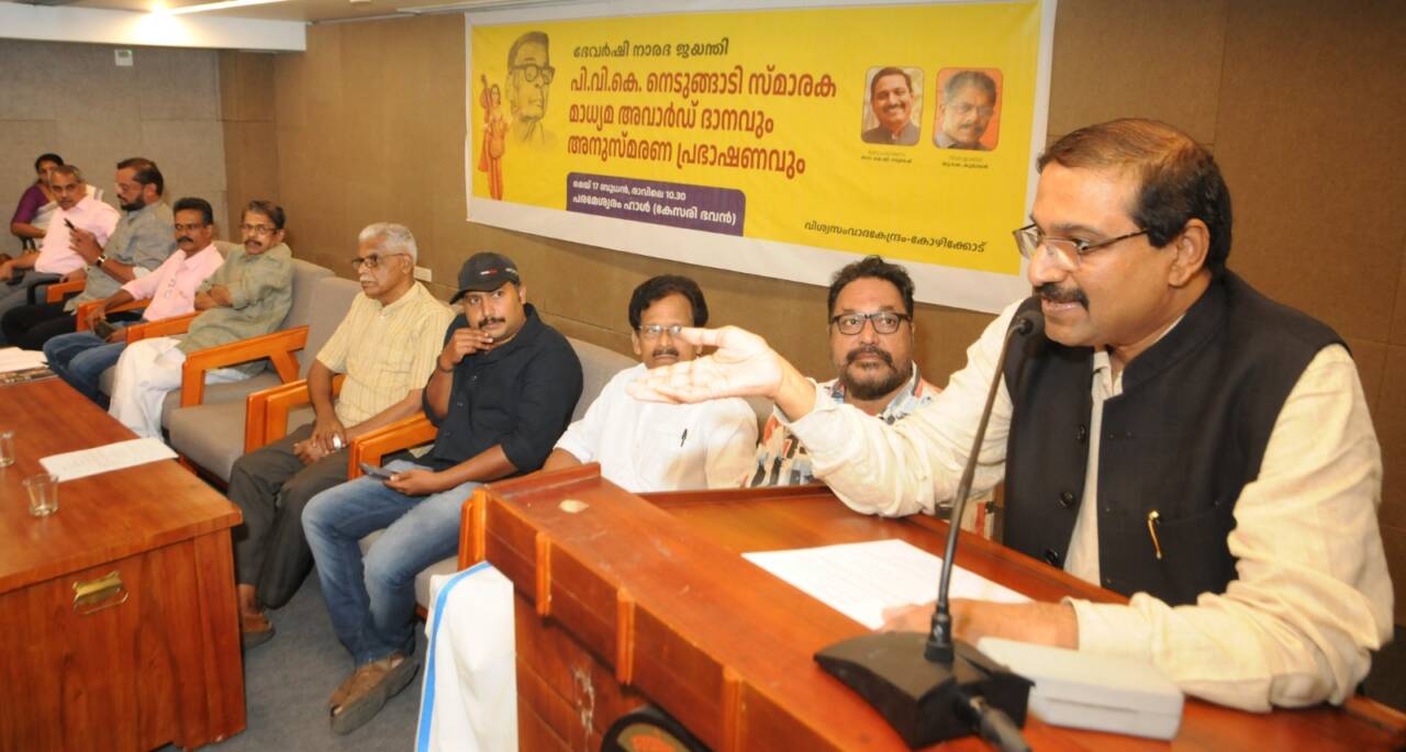 കോഴിക്കോട്: ജനങ്ങൾക്ക് മാധ്യമസാക്ഷരത പകർന്നു നൽകേണ്ടത് കാലഘട്ടത്തിന്റെ ആവശ്യമാണെന്ന് മധ്യപ്രദേശ് മഖൻലാൽ ചതുർവേദി യൂണിവേഴ്സിറ്റി ഓഫ് ജേണലിസം വൈസ് ചാൻസിലർ പ്രൊഫ. കെ.ജി. സുരേഷ് പറഞ്ഞു. ദേവർഷി നാരദജയന്തിയുടെ ഭാഗമായി വിശ്വസംവാദകേന്ദ്രത്തിന്റെ ആഭിമുഖ്യത്തിൽ കേസരി ഭവനിലെ പരമേശ്വരം ഹാളിൽ സംഘടിപ്പിച്ച പി.വി.കെ. നെടുങ്ങാടി സ്മാരക മാധ്യമ അവാർഡ് സമർപ്പണ പരിപാടിയിൽ ‘വാർത്തകളിലെ വ്യാജ ഉള്ളടക്കം’ എന്ന വിഷയത്തിൽ മുഖ്യപ്രഭാഷണം നടത്തുകയായിരുന്നു അദ്ദേഹം.
