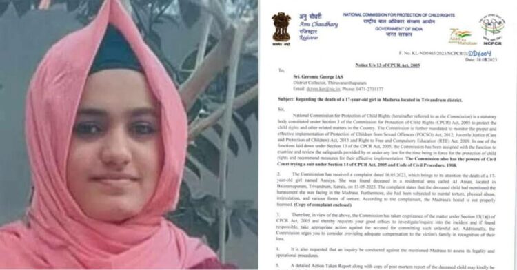 തിരുവനന്തപുരം: ബാലരാമപുരത്ത് മദ്രസ്സയിൽ വിദ്യാർത്ഥി തൂങ്ങിമരിച്ച സംഭവത്തിൽ കേസെടുത്ത് ദേശീയ ബാലാവകാശ കമ്മിഷൻ .എബിവിപി നാഷണൽ എക്സിക്യൂട്ടീവ് മെമ്പർ ഗ്രീഷ്മ നൽകിയ പരാതിയുടെ അടിസ്ഥാനത്തിലാണ് ദേശീയ ബലാവകാശ സംരക്ഷണ കമ്മീഷൻ അംഗം ഡോ ആർ ജി ആനന്ദ് ജില്ലാ കളക്ടറോട് 7 ദിവസത്തിനുള്ളിൽ നടപടി സ്വീകരിച്ച് റിപ്പോർട്ട് നൽകാൻ ആവശ്യപ്പെട്ടത്. കുട്ടിയുടെ കുടുംബത്തിന് ആവശ്യമായ നഷ്ടപരിഹാരം അനുവദിക്കാനും നിർദ്ദേശം നൽകി.