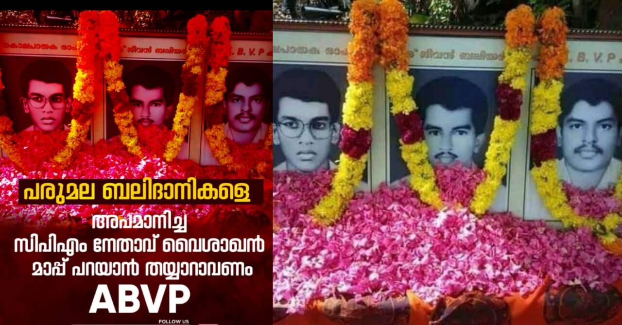 പത്തനംതിട്ട: പരുമല ബലിദാനികളെ അപമാനിച്ച സിപിഎം നേതാവ് വൈശാഖന്‍ മാപ്പ് പറയണമെന്ന് എബിവിപി ആവശ്യപ്പെട്ടു. പരുമല പമ്പ കോളേജില്‍ എസ്എഫ്ഐക്കാര്‍ കൊലപ്പെടുത്തിയ എബിവിപി പ്രവര്‍ത്തകരായ അനു പി.എസ്, കിം കരുണാകരന്‍, സുജിത്ത് എന്നിവര്‍ യുവജനോത്സവത്തിനിടെ മദ്യപിച്ചു ആറ്റില്‍ ചാടി എന്ന് മാതൃഭൂമി ചാനല്‍ ചര്‍ച്ചയില്‍ സിപിഎം നേതാവ് വൈശാഖന്‍ ആക്ഷേപിച്ചിരുന്നു.