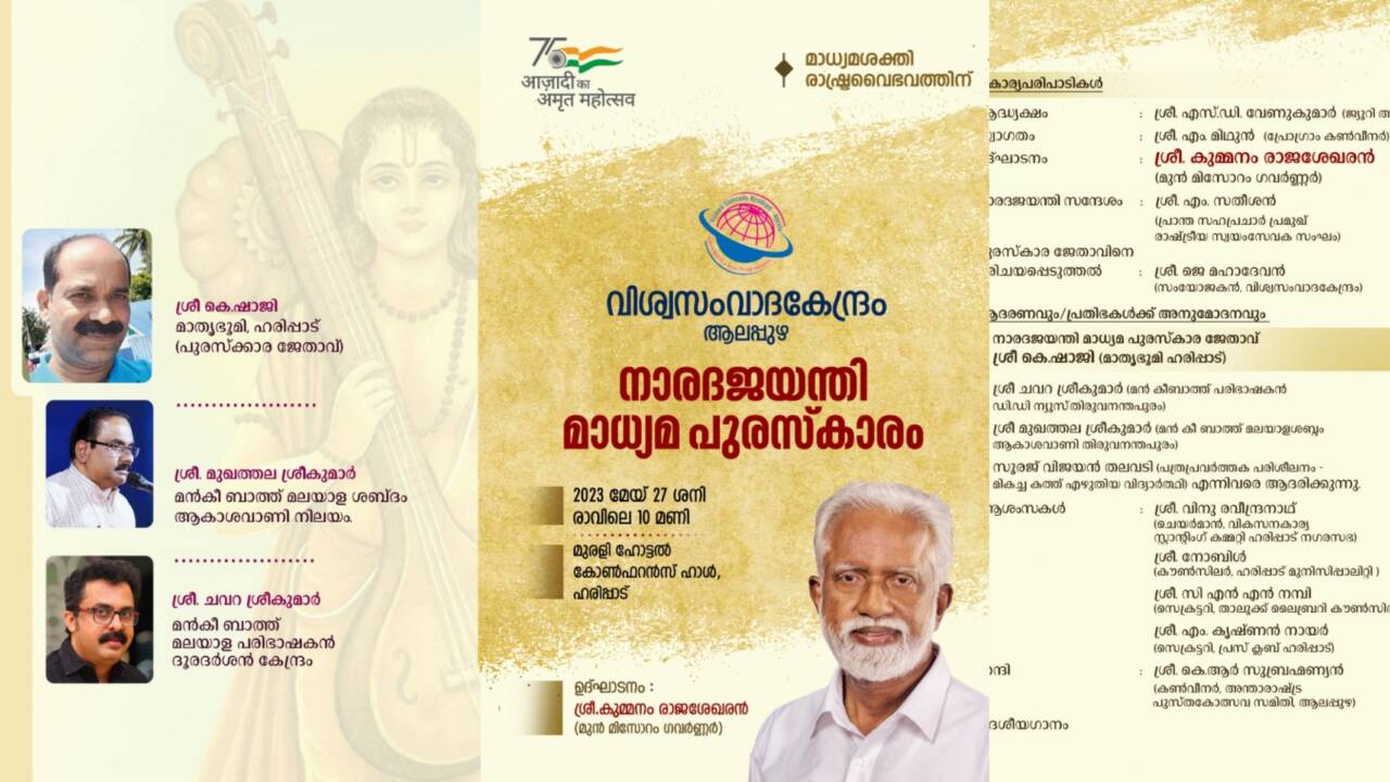 27 ശനിയാഴ്ച രാവിലെ 10 ന് ഹരിപ്പാട്ട് നടക്കുന്ന സമ്മേളനത്തിൽ മിസോറാം മുൻ ഗവർണർ കുമ്മനം രാജശേഖരൻ സമ്മാനം വിതരണം ചെയ്യും. ആർ. എസ്. എസ്. സഹപ്രചാർ പ്രമുഖ് എം. സതീശൻ നാരദജയന്തി സന്ദേശം നൽകും. മൻകീ ബാത്ത് പരിഭാഷപ്പെടുത്തിയ ചവറ ശ്രീകുമാർ, ആകാശവാണിയിലൂടെ ശബ്ദം നൽകിയ മുഖത്തല ശ്രീകുമാർ എന്നിവരെ ആദരിക്കും. ചടങ്ങിൽ മുതിർന്ന മാധ്യമപ്രവർത്തകർ വിത്യസ്ത മേഖലകളിലെ പ്രതിഭകൾ, അവാർഡുകൾ ലഭിച്ച മാധ്യമ പ്രവർത്തകരേയും ആദരിക്കും.