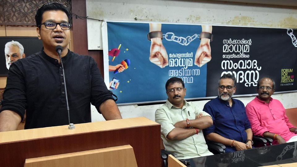 കേരളത്തിലെ മാധ്യമ പ്രവര്‍ത്തനം രാജ്യത്തിനാകെ മാതൃകയായിരുന്നു. ഭരണകൂടത്തിനെതിരെ ശക്തമായ വിമര്‍ശനങ്ങളാണ് ആദ്യകാലം മുതല്‍ കേരളത്തിലെ മാധ്യമങ്ങള്‍ ഉയര്‍ത്തിയിരുന്നതെന്ന് അധ്യക്ഷത വഹിച്ച ജന്മഭൂമി ഓണ്‍ലൈന്‍ എഡിറ്റര്‍ പി. ശ്രീകുമാര്‍. മാധ്യമപ്രവര്‍ത്തകന് വാര്‍ത്താ ഉറവിടം എന്നത് പവിത്രമാണ്. അത് ആരോടും പറയാന്‍ പാടില്ലെന്നതാണ് മാധ്യമപ്രവര്‍ത്തകന്റെ ധര്‍മം. കേരളത്തിലെ പോലീസ് ഈ ഉറവിടങ്ങള്‍ വെളിപ്പെടുത്താനാണ് മാധ്യമപ്രവര്‍ത്തകരുടെ മേല്‍ കേസെടുക്കുകയും ഭീഷണിപ്പെടുത്തുകയും ചെയ്യുന്നത്. കേരളത്തില്‍ നടക്കുന്നത് മാധ്യമ അടിയന്തരാവസ്ഥയാണെന്നും അദ്ദേഹം പറഞ്ഞു.
