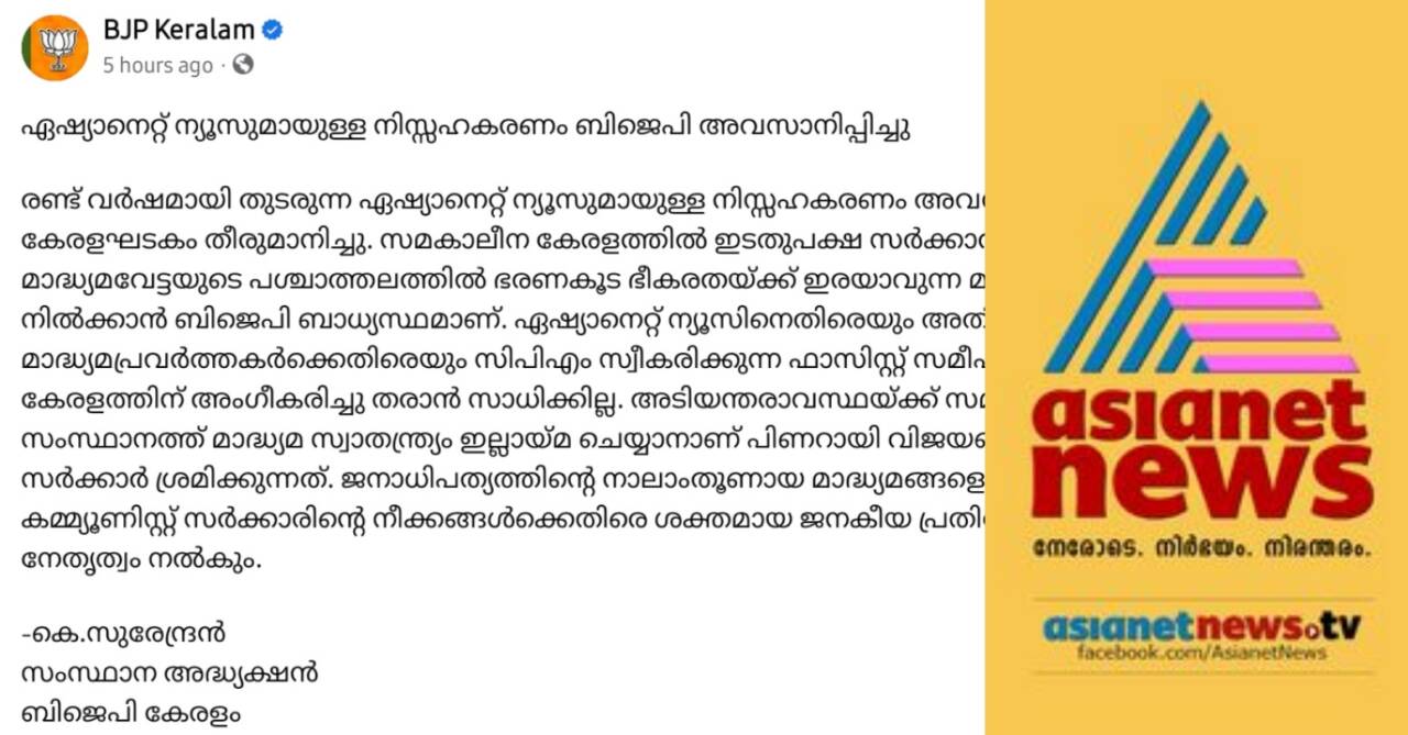 തിരുവനന്തപുരം: രണ്ട് വര്ഷമായി തുടരുന്ന ഏഷ്യാനെറ്റ് ന്യൂസുമായുള്ള നിസ്സഹകരണം അവസാനിപ്പിക്കാന് ബിജെപി കേരളഘടകം തീരുമാനിച്ചു. സമകാലീന കേരളത്തില് ഇടതുപക്ഷ സര്ക്കാര് നടത്തുന്ന മാദ്ധ്യമവേട്ടയുടെ പശ്ചാത്തലത്തില് ഭരണകൂട ഭീകരതയ്ക്ക് ഇരയാവുന്ന മാദ്ധ്യമങ്ങള്ക്കൊപ്പം നില്ക്കാന് ബിജെപി ബാധ്യസ്ഥമാണ്. ഏഷ്യാനെറ്റ് ന്യൂസിനെതിരെയും അതിലെ മാദ്ധ്യമപ്രവര്ത്തകര്ക്കെതിരെയും സിപിഎം സ്വീകരിക്കുന്ന ഫാസിസ്റ്റ് സമീപനം ജനാധിപത്യ കേരളത്തിന് അംഗീകരിച്ചു തരാന് സാധിക്കില്ല.