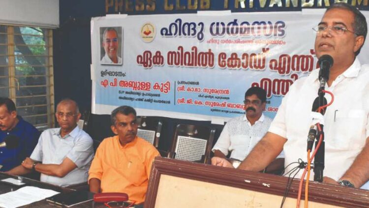 കോണ്‍ഗ്രസും സിപിഎമ്മും ലീഗും ഒരുമിച്ച് നില്‍ക്കുമ്പോഴെല്ലാം ഭാരതത്തില്‍ വിഭജനം അല്ലെങ്കില്‍ കലാപം ഉണ്ടാകാറുണ്ടെന്ന് കുരുക്ഷേത്ര ചീഫ് എഡിറ്റര്‍ കാ.ഭാ.സുരേന്ദ്രന്‍ പറഞ്ഞു. രാജ്യവിഭജനത്തിനുവേണ്ടി 1940 ല്‍ ലീഗും 42 ല്‍ കമ്മ്യൂണിസ്റ്റുപാര്‍ട്ടിയും 47 ല്‍ കോണ്‍ഗ്രസും രാജ്യവിഭജനത്തിനുവേണ്ടി പ്രമേയം പാസാക്കി. തുടര്‍ന്ന് ഹിന്ദിക്കെതിരെ, മതംമാറ്റത്തിനുവേണ്ടി, ഷാബാനുകേസില്‍, അയോധ്യതര്‍ക്കത്തില്‍, പൗരത്വനിയമത്തിനെതിരെ എന്നുവേണ്ട കലാപത്തിനുള്ള അവസരങ്ങളിലെല്ലാം ഇവര്‍ ഒത്തുകൂടുന്നുവെന്നും അദ്ദേഹം പറഞ്ഞു. അഡ്വ. ശാസ്തമംഗലം അജിത്കുമാര്‍ അധ്യക്ഷത വഹിച്ചു. യുക്തികൊണ്ട് ചിന്തിക്കുന്നവര്‍ക്ക് അത്യാവശ്യമായ ഒന്നാണ് ഏക സിവില്‍ കോഡ് എന്ന് അദ്ദേഹം പറഞ്ഞു. മാധ്യമപ്രവര്‍ത്തകന്‍ ജി.കെ. സുരേഷ്ബാബു, എ.കെ.എന്‍. അരുണ്‍, ഷാജു വേണുഗോപാല്‍ തുടങ്ങിയവര്‍ സംസാരിച്ചു.