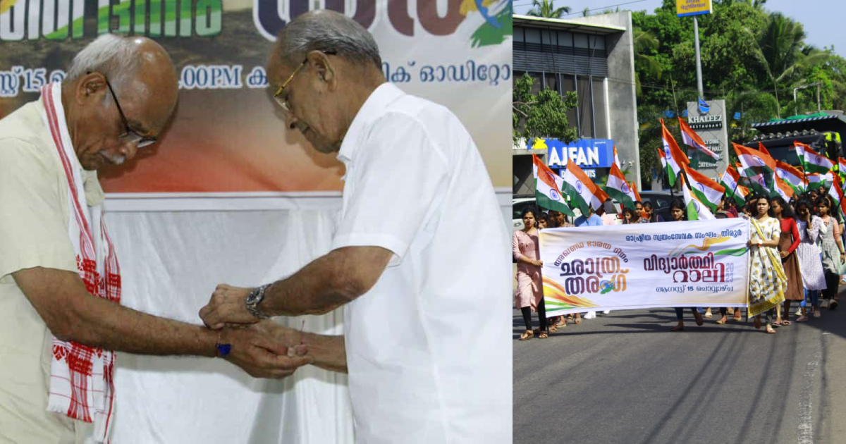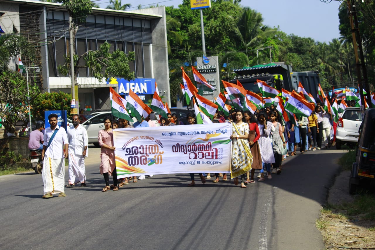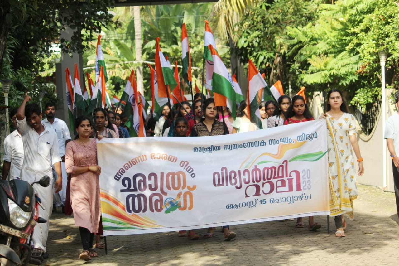 തിരൂർ: ഭാരതം 77 ആമത് സ്വാതന്ത്ര്യ ദിനം ആഘോഷിക്കുന്ന വേളയിൽ, രാഷ്ട്രീയ സ്വയംസേവക സംഘം – തിരൂർ ജില്ല അഖണ്ഡഭാരത ദിനവും വിദ്യാർത്ഥി സംഗമവും നടത്തി. മെട്രോമാൻ പത്മ വിഭൂഷൺ ഇ. ശ്രീധരൻ അധ്യക്ഷത വഹിച്ചു . ഇ. ശ്രീധരൻ സാറുമായി വിദ്യാർത്ഥികളുടെ ചോദ്യോത്തര വേളയും പിന്നീട് രാഷ്ട്രീയ സ്വയംസേവക സംഘം മുൻ അഖില ഭാരതീയ കാര്യകാരി സദസ്യൻ മാന്യ. എസ് സേതുമാധവൻ മുഖ്യപ്രഭാഷണം നടത്തി ശേഷം ഭാരത്മാതാ പൂജയും രക്ഷാബന്ധനോട് കൂടെയും ദേശീയഗാനാലാപനത്തോടെ പരിപാടി അവസാനിച്ചു.