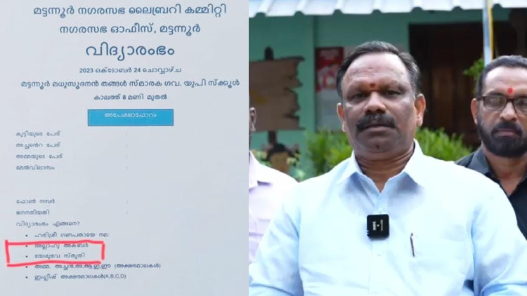 മട്ടന്നൂർ മധുസൂദനൻ തങ്ങൾ സ്മാരക ഗവ. യുപി സ്കൂളിൽ വച്ച് മട്ടന്നൂർ നഗരസഭ ലൈബ്രറി കമ്മിറ്റിയുടെ നേതൃത്വത്തിൽ നടത്തപ്പെടുന്ന വിദ്യാരംഭം ചടങ്ങിലേക്കുള്ള അപേക്ഷാ ഫോമിലാണ് ‘വിദ്യാരംഭം എങ്ങനെ എന്ന ചോദ്യം കൊടുത്തതിന് ശേഷം ഹരിശ്രി ഗണപതയേ നമഃ, അല്ലാഹു അക്ബർ, യേശുവേ സ്തുതി തുടങ്ങിയ ഓപ്ഷൻസ് നൽകിയിരിക്കുന്നത്. സംഭവത്തിൽ നിരവധി പേരാണ് വിമർശിച്ച് രംഗത്തുവന്നിരിക്കുന്നത്.