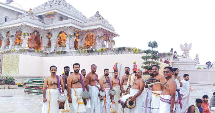കാഞ്ഞങ്ങാട്: പത്ത് ഡിഗ്രിയും അതിനുതാഴേക്കും താപനിലയാകുമ്പോഴും അയോദ്ധ്യയിലെ ശ്രീരാമ ജന്മഭൂമിയില് ഷര്ട്ട്പോലുമിടാതെ പഞ്ചവാദ്യം അവതരിപ്പിക്കുന്നത് കാഞ്ഞങ്ങാട്ടെ കലാസംഘം. പ്രാണപ്രതിഷ്ഠയ്ക്ക് ശേഷമുള്ള പ്രഥമ ഉത്സവത്തിന് പഞ്ചവാദ്യം അവതരിപ്പിക്കുന്നത് കാഞ്ഞങ്ങാട്ടെ മഡിയന് രാധാകൃഷ്ണ മാരാരും സംഘവും.