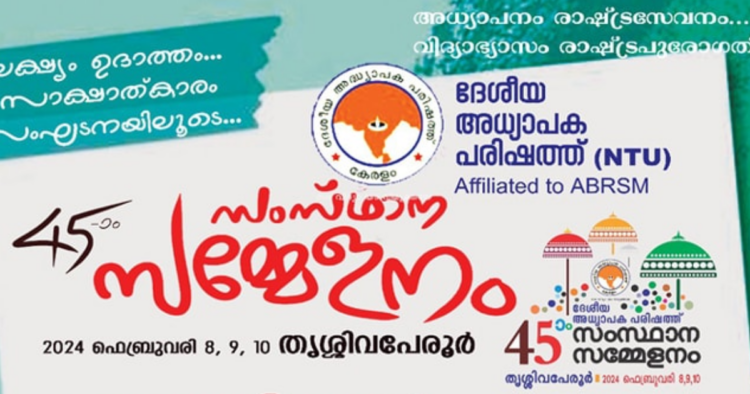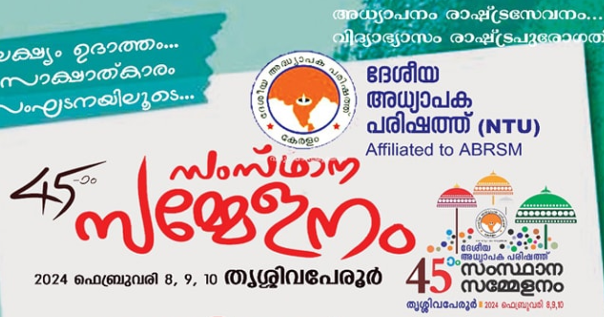 തൃശൂര്: ദേശീയ അദ്ധ്യാപക പരിഷത്തിന്റെ (എന്ടിയു) 45-ാം സംസ്ഥാന സമ്മേളനം 8, 9, 10 തീയതികളിലായി തൃശൂരില് നടക്കുമെന്ന് സ്വാഗതസംഘം ചെയര്മാന് പി.എന്. ഉണ്ണിരാജന്, സംസ്ഥാന പ്രസിഡന്റ് പി.എസ്. ഗോപകുമാര് എന്നിവര് അറിയിച്ചു. ആയിരത്തിലധികം പ്രതിനിധികള് പങ്കെടുക്കും. നാളെ വൈകീട്ട് കോട്ടപ്പുറം പ്രതാപ് നിവാസില് സമ്പൂര്ണ സംസ്ഥാന സമിതി സ്വാമി പുരുഷോത്തമാനന്ദ സരസ്വതി ഉദ്ഘാടനം ചെയ്യും.