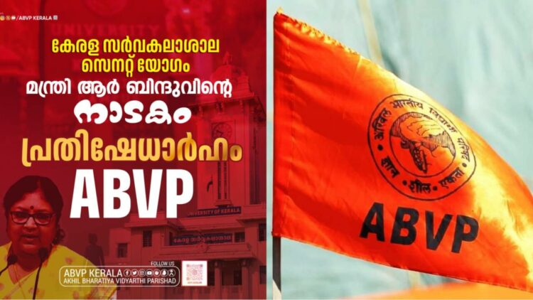 കേരള സർവകലാശാല സെനറ്റ് യോഗത്തിൽ മന്ത്രി ആർ ബിന്ദുവിന്റെ നാടകം പ്രതിഷേധാർഹമെന്ന് എബിവിപി സംസ്ഥാന സെക്രട്ടറി ഇ യു ഈശ്വരപ്രസാദ്. കേരള സർവ്വകലാശാല സെനറ്റ് യോഗത്തിൽ സേർച്ച് കമ്മിറ്റിയിലേക്ക് പ്രതിനിധിയെ നൽകാനുള്ള തീരുമാനത്തെ ഉന്നത വിദ്യാഭ്യാസ മന്ത്രിയും മറ്റു ഇടതുപക്ഷ അംഗങ്ങളും ചേർന്ന് അട്ടിമറിച്ചത് ഉന്നത വിദ്യാഭ്യാസ രംഗത്തോടും ജുഡീഷ്യറിയോടുമുള്ള അപരാധവും വെല്ലുവിയുമാണ്. വൈസ് ചാൻസിലർ അധ്യക്ഷത വഹിക്കേണ്ട യോഗത്തിൽ ചാൻസിലറായ ഗവർണറുടെ നിർദ്ദേശമോ അനുവാദമോ ഇല്ലാതെ അധ്യക്ഷത വഹിച്ചതും വിസിയെ തൻ്റെ കർത്തവ്യനിർവഹണത്തെ തടസ്സപ്പെടുത്തിയതും മന്ത്രി ആർ ബിന്ദു നടത്തിയ അധികാര ദുർവിനിയോഗമാണ്.