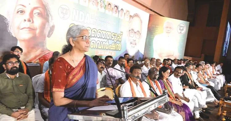 കേരള മോഡല്‍ എന്നൊക്കെ പറയുമ്പോഴും കേരളത്തിന്റെ വിദ്യാഭ്യാസം, ആരോഗ്യം, ഗ്രാമീണനഗര വികസനം തുടങ്ങിയവയെല്ലാം ദേശീയ നിലവാരത്തിനും താഴെയാണ്. മികച്ച മാനവശേഷിയുള്ള ഒരു യുവ സമൂഹമാണ് കേരളത്തിലേത്. സംരംഭകത്വത്തിനോ വ്യവസായങ്ങള്‍ കൊണ്ടു വരുന്നതിനോ ഈ സംസ്ഥാനത്തിനാകുന്നില്ല. കേരളത്തിലെ യുവസമൂഹത്തിന്റെ അവസ്ഥ സങ്കടകരമാണെന്നും നിര്‍മല പറഞ്ഞു. മോദി അധികാരത്തില്‍ വന്നതിനുശേഷം 2024 മാര്‍ച്ച് വരെ 1.58 ലക്ഷം കോടി രൂപയാണ് നല്കിയിട്ടുള്ളത്. ഫിനാന്‍സ് കമ്മിഷന്റെ ശുപാര്‍ശ ഇല്ലാതെ പലിശ രഹിത വായ്പാ ഇനത്തില്‍ 2021ല്‍ 2224 കോടി രൂപയാണ് കൊടുത്തത്. മോദി കൊടുത്തതിനെക്കുറിച്ചു പറയുന്നില്ല.