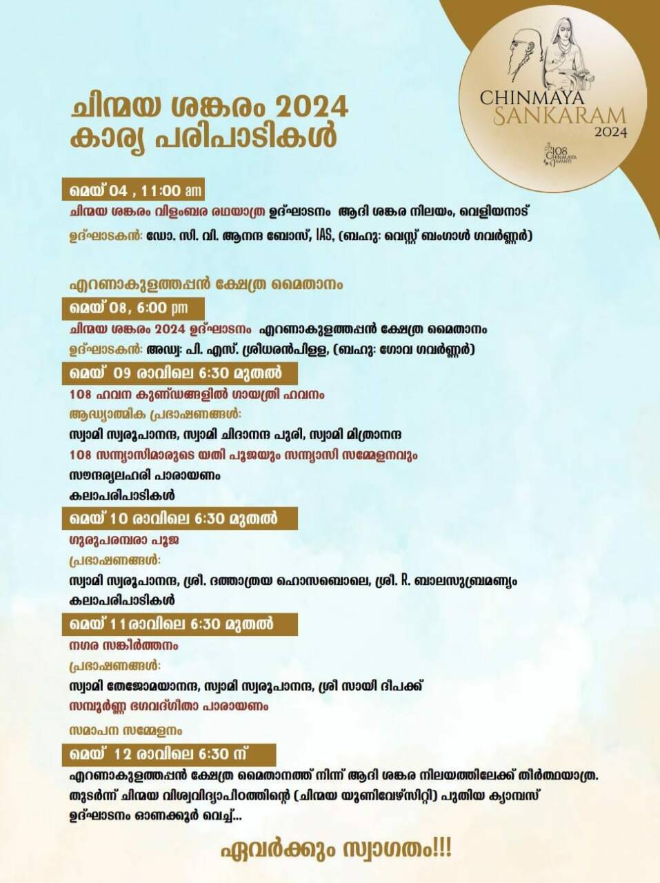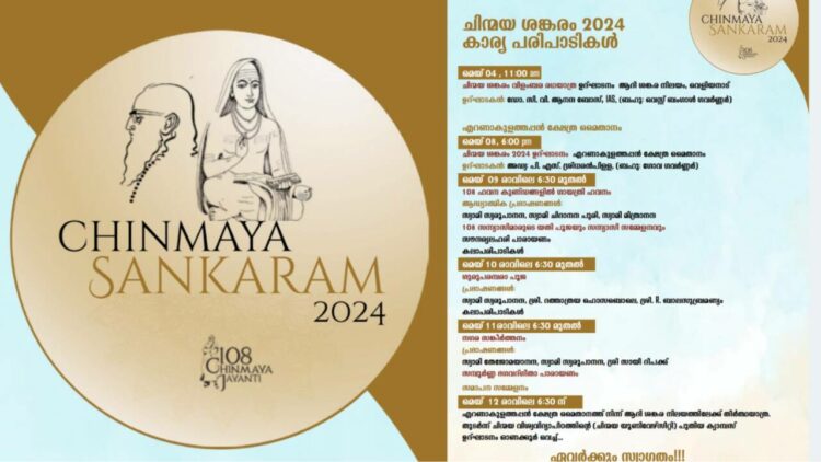 നാളെ വൈകുന്നേരം ചിന്മയ ശങ്കരത്തിന്റെ വിളംബരമായി എറണാകുളം ജില്ലയിൽ പര്യടനം നടത്തുന്ന രഥയാത്രയ്ക്ക് എറണാകുളത്തപ്പൻ മൈതാനത്തിൽ സ്വീകരണം നൽകും. തുടർന്ന് ഗുരുപാദുക പൂജ. ഉദ്ഘാടന സമ്മേളനത്തിൽ ഗോവ ഗവർണർ അഡ്വ. പി.എസ്. ശ്രീധരൻപിള്ള ചിന്മയ ശങ്കരം 2024-ന് തിരി തെളിക്കും. ചിന്മയ മിഷൻ മുൻ ആഗോള അധ്യക്ഷൻ സ്വാമി തേജോമയാനന്ദ, ചിന്മയ മിഷന്റെ ആഗോള അധ്യക്ഷൻ സ്വാമി സ്വരൂപാനന്ദ സരസ്വതി, സംസ്ഥാന അധ്യക്ഷൻ സ്വാമി വിവിക്താനന്ദ സരസ്വതി തുടങ്ങിയവർ സംബന്ധിക്കും. പ്രഭാഷണങ്ങൾ, ഭഗവത് ഗീത – സൗന്ദര്യലഹരി പാരായണം തുടങ്ങിയവ നടക്കും. ആർ.എസ്.എസ് സർകാര്യവാഹ് ദത്താത്രേയ ഹൊസബാളെ, അഭിഭാഷകൻ സായി ദീപക് തുടങ്ങിയ പ്രമുഖർ ചിന്മയ ശങ്കരത്തിന്റെ വേദിയിലെത്തും. ഒൻപതിന് ചിന്മയ ശങ്കരത്തിൽ പുലർച്ചെ 6.30 മുതൽ 8.30 വരെ 108 ഹോമകുണ്ഡങ്ങളിൽ ഗായത്രിഹോമം നടത്തും. 11 മുതൽ 12.30 വരെ ആചാര്യസംഗമവും യതിപൂജയും നടക്കും. പതിനായിരത്തോളം പേരെ അണിനിരത്തിയുള്ള സൗന്ദര്യലഹരി പാരായണവും നടക്കും. ശൃംഗേരി പീഠത്തിനു കീഴിലുള്ള യാദത്തൂർ മഠത്തിലെ ശങ്കര ഭാരതി സ്വാമികളുടെ നേതൃത്വത്തിൽ മേയ് ഒൻപതിന് ഉച്ചയ്ക്ക് രണ്ടുമുതലാണ് പാരായണം. മേയ് 11-ന് ഉച്ചയ്ക്ക് രണ്ടുമുതൽ ആയിരങ്ങൾ പങ്കെടുക്കുന്ന സമൂഹ ഭഗവത് ഗീതാപാരായണവും നടക്കും. ഗീതാധ്യാനം, പൂജഗീത അഷ്ടോത്തര ശതനാമാർച്ചന, ഗീതാ ആരതി സൗജന്യ ഗീതഗ്രന്ഥ വിതരണം എന്നിവയുണ്ടാകും.
