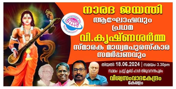 തിരുവനന്തപുരം: വിശ്വ സംവാദ കേന്ദ്രത്തിന്റെ നേതൃത്വത്തിൽ നാരദ ജയന്തി ആഘോഷവും പ്രഥമ കൃഷ്ണ ശർമ്മ സ്മാരക മാധ്യമ പുരസ്കാര സമർപ്പണവും നാളെ തിരുവനന്തപുരം പ്രസ് ക്ലബ്ബിൽ നടക്കും. വൈകുന്നേരം 3.30ന് പി. ഗിരീഷ് കുമാറിന്റെ അധ്യക്ഷതയിൽ ആരംഭിക്കുന്ന ചടങ്ങ് പ്രശസ്ത ചരിത്രകാരൻ ഡോ. ടി പി ശങ്കരൻകുട്ടി ഉദ്ഘാടനം നിർവഹിക്കും. കേസരി മുഖ്യ പത്രാധിപർ ഡോ. എൻ.ആർ മധു മുഖ്യ പ്രഭാഷണം നടത്തും. പ്രഥമ വി. കൃഷ്ണ ശർമ്മ സ്മാരക മാധ്യമ പുരസ്കാരം മാതൃഭൂമി ന്യൂസ് എഡിറ്റർ ഡോ. ജി പ്രസാദ് കുമാറിന് ഡോ. ടി പി ശങ്കരൻകുട്ടി സമ്മാനിക്കും.