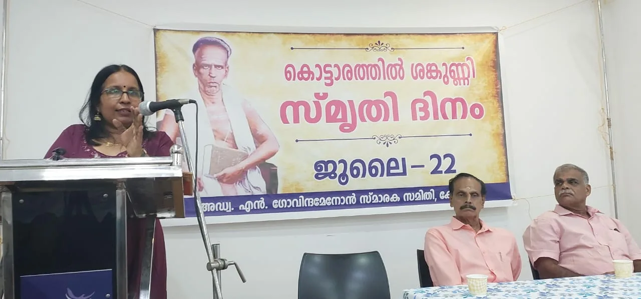 കോട്ടയം: കഥ പോലെ കാര്യങ്ങളും ചരിത്രം തന്നെയും രേഖപ്പെടുത്തിയ കൊട്ടാരത്തിൽ ശങ്കുണ്ണി മലയാളത്തിന് ഗുരുസ്ഥാനീയനായ പണ്ഡിതനും ചരിത്ര രചനയുടെ പിതാവും ആണെന്ന് കൊട്ടാരത്തിൽ ശങ്കുണ്ണിയുടെ എൺപത്തി ഏഴാമത് സ്മൃതിദിന യോഗത്തിൽ ബസേലിയസ് കോളജ് അദ്ധ്യാപിക പ്രൊ. മഞ്ജുഷ പണിക്കർ അഭിപ്രായപ്പെട്ടു. കൊട്ടാരത്തിൽ ശങ്കുണ്ണിയെ വായിച്ചാൽ ഭക്തി ആവശ്യമുള്ളവർക്ക് ഭക്തിയും ചരിത്രം വേണ്ടവർക്ക് അതും സാഹിത്യം വേണ്ടവർക്ക് സാഹിത്യ തത്വശാസ്ത്രം തന്നെയും ലഭ്യമാകുന്നു. അദ്ദേഹത്തെ കൂടുതൽ പഠിക്കുവാൻ സമൂഹത്തിന് പ്രചോദനമേകണം ഇത്തരം അനുസ്മരണങ്ങൾ എന്നും പ്രൊഫസർ പറഞ്ഞു.