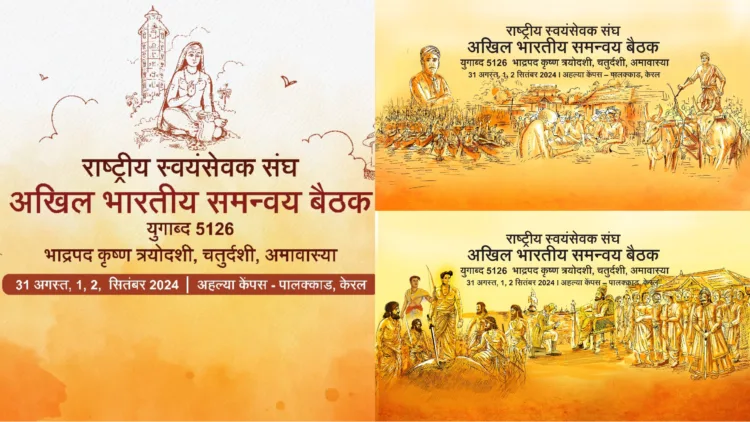 പാലക്കാട്: വാളയാര്‍ അഹല്യ ക്യാമ്പസില്‍ ഇന്നലെ ആരംഭിച്ച ആര്‍എസ്എസ് ത്രിദിന അഖില ഭാരതീയ സമന്വയ ബൈഠക്കിൻ്റെ വേദിയുടെ പശ്ചാത്തലമാവുന്നത് കേരള നവോത്ഥാന ചരിത്രത്തിലെ സുപ്രധാന മുഹൂർത്തങ്ങളും കേരളത്തനിമയുടെ ആവിഷ്കാരങ്ങളും. ആദി ശങ്കരാചാര്യർ, കാലടിയിലെ ശങ്കരസ്തൂപം, ശിവഗിരിയുടെ പശ്ചാത്തലത്തിൽ ശ്രീനാരായണ ഗുരുദേവൻ, പറയിപെറ്റ പന്തിരുകുലത്തിലെ നറാണത്ത് ഭ്രാന്തൻ എന്നീ ചിത്രങ്ങളാണ്ഉദ്ഘാടന ദിനത്തിൽ വേദിയെ അലങ്കരിച്ചത്.പണ്ഡിറ്റ് കറുപ്പൻ്റെ കായൽ സമ്മേളനം, മഹാത്മജിയുടെ വൈക്കം സത്യഗ്രഹ സമരവേദി സന്ദർശനം, മഹാത്മാ അയ്യങ്കാളിയുടെ വില്ലുവണ്ടി സമരം, പഴശ്ശിരാജാവിൻ്റെ നേതൃത്വത്തിൽ ഗോത്ര ജനതയടക്കം പങ്കാളികളായ സ്വാതന്ത്ര്യ സമര പോരാട്ടം, കുളച്ചൽ യുദ്ധത്തിലെ മാർത്താണ്ഡവർമ്മയുടെ വിജയം തുടങ്ങിയ ചരിത്രപ്രധാന സംഭവങ്ങളാണ് തുടർന്നുള്ള ദിവസങ്ങളിൽ വേദിയുടെ പശ്ചാത്തലമാവുക.
