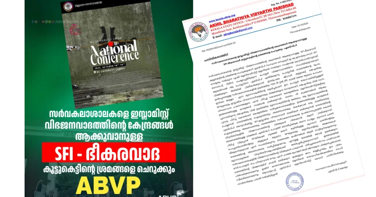 തിരുവനന്തപുരം: സർവകലാശാലകളെ ഇസ്ലാമിസ്റ്റ് വിഭജനവാദത്തിന്റെ കേന്ദ്രങ്ങൾ ആക്കുവാനുള്ള എസ്എഫ്ഐ ഭീകരവാദി കൂട്ടുകെട്ടിന്റെ ശ്രമങ്ങളെ ചെറുക്കുമെന്ന് എബിവിപി സംസ്ഥാന സെക്രട്ടറി ഇ.യു ഈശ്വരപ്രസാദ്. എസ്എഫ്ഐ നേതൃത്വം നൽകുന്ന എംജി യൂണിവേഴ്സിറ്റി യൂണിയൻ നടത്തുന്ന നാഷ്ണൽ കോൺഫറൻസുമായി ബന്ധപെട്ട് റിലീസ് ചെയ്യപ്പെട്ടിരിക്കുന്ന പോസ്റ്റർ വിഭജനവാദത്തിനെ സഹായിക്കുന്നതാണ്. ആയതിനാൽ ആ പോസ്റ്ററിനെ എബിവിപി എതിർക്കുന്നു. പോസ്റ്ററിൽ ഭാരതത്തിന്റെ ഭൂപടം വിഭജിക്കുന്ന രീതിയിൽ ചിത്രീകരിക്കുന്നത് ഇടതുപക്ഷ-ജിഹാദി കൂട്ടുകെട്ട് ജെഎൻയു ഉൾപ്പെടെയുള്ള സർവകലാശാലകളിൽ ഉയർത്തിയ ‘भारत तेरे टुकड़े होंगे- ഭാരത് തേരേ തുകടെ ഹോംഗേ ഇൻഷാ അള്ളാ’ എന്ന മുദ്രാവാക്യത്തിന്റെ തുടർച്ചയാണ്. ഈ പോസ്റ്റർ തയാറാക്കിയിട്ടുള്ളത് എസ്എഫ്ഐ യുടെയും ഇസ്ലാമിക വിഘടനവാദികളുടെയും അജണ്ടയുടെ ഭാഗമായാണ്.