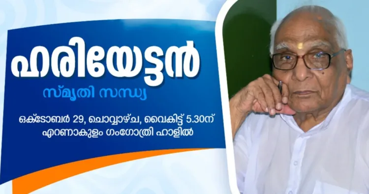 കൊച്ചി: മുതിര്ന്ന ആര്എസ്എസ് പ്രചാരകനും സൈദ്ധാന്തികനും എഴുത്തുകാരനുമായ ആര്. ഹരിയുടെ ഒന്നാമത് അനുസ്മരണ പരിപാടി നാളെ വൈകിട്ട് 5.15ന് എറണാകുളം ഗംഗോത്രി ഹാളില് ചേരും. രാഷ്ട്ര ധര്മ്മ പരിഷത്തിന്റെ നേതൃത്വത്തില് സംഘടിപ്പിക്കുന്ന ഹരിയേട്ടന് സ്മൃതി സന്ധ്യയില് ലക്ഷ്മിബായ് ധര്മ്മ പ്രകാശന് ട്രസ്റ്റ് മാനേജിങ് ട്രസ്റ്റി എം. മോഹനന് അനുസ്മരണ പ്രഭാഷണം നടത്തും.