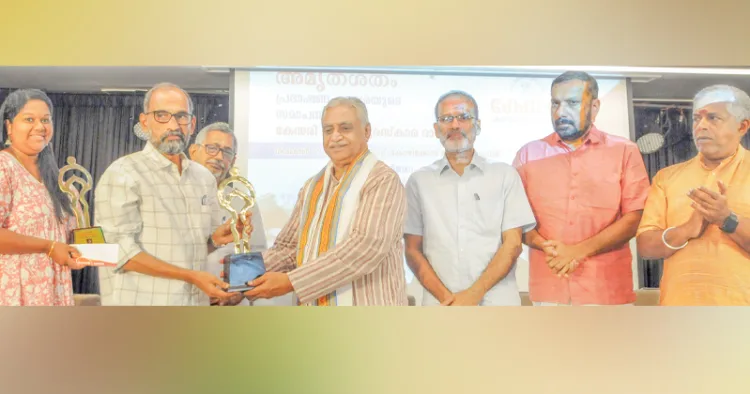 പരിപാടിയില് അഡ്വ. പി.കെ. ശ്രീകുമാര് അധ്യക്ഷനായി. ഭാരതീയ വിചാരകേന്ദ്രം ഡയറക്ടര് ആര്. സഞ്ജയന് എം. രാഘവന് അനുസ് മരണം നടത്തി. ഷാജന് സ്കറിയ, ഡോ. ശ്രീശൈലം ഉണ്ണിക്കൃഷ്ണന്, ഡോ. എന്.ആര്. മധു തുടങ്ങിയവര് സംസാരിച്ചു. മുരളി പാറപ്പുറം മറുമൊഴി നല്കി. ഗായത്രി മധുസൂദന്റെ മോഹിനിയാട്ടം അരങ്ങേറി.