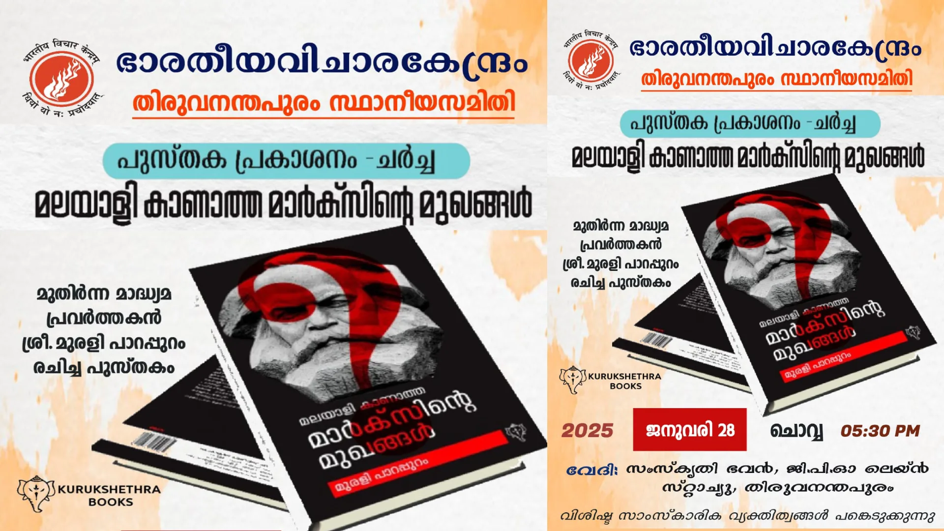 തിരുവനന്തപുരം: ഭാരതീയ വിചാരകേന്ദ്രം തിരുവനന്തപുരം സ്ഥാനീയ സമിതിയുടെ നേതൃത്വത്തിൽ മുതിർന്ന മാദ്ധ്യമ പ്രവർത്തകൻ മുരളി പാറപ്പുറം രചിച്ച “മലയാളി കാണാത്ത മാർക്സിൻ്റെ മുഖങ്ങൾ” പുസ്തകത്തിൻ്റെ പ്രകാശനവും ചർച്ചയും നാളെ വൈകിട്ട് 5.30ന് സ്റ്റാച്യൂവിലുള്ള സംസ്കൃതി ഭവനിൽ നടക്കും.