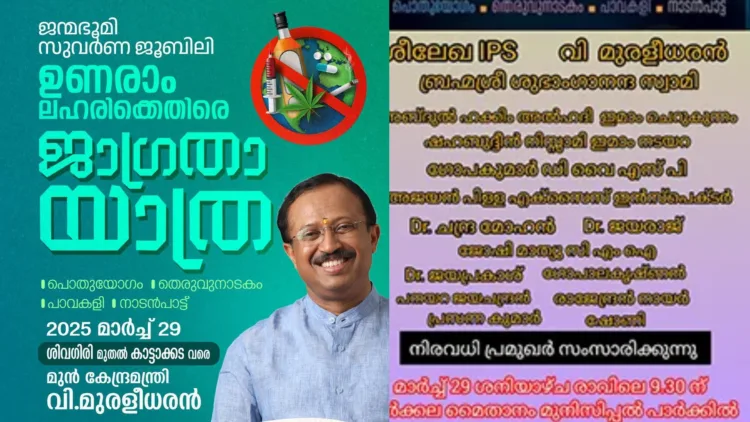 ‘ഉണരാം ലഹരിക്കെതിരെ’ എന്ന സന്ദേശമുയര്ത്തി മുൻ കേന്ദ്രമന്ത്രി വി.മുരളീധരൻ നയിക്കുന്ന ജാഗ്രതാ യാത്രയ്ക്ക് ശിവഗിരിയില് സ്വാമി ശുഭാംഗാനന്ദ ദീപം തെളിയിച്ചു. ലഹരിവിരുദ്ധ ജാഗ്രതാ യാത്രാ ചെയർപേഴ്സൺ മുൻ ഡിജിപി ആർ. ശ്രീലേഖ മുഖ്യാഥിതിയായി.
