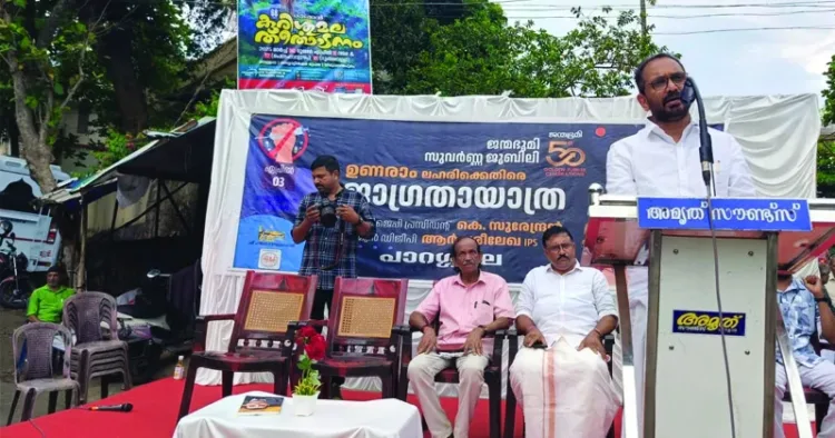 ലഹരി വിരുദ്ധ സന്ദേശമുയത്തി ജന്മഭൂമിയുടെ അൻപതാമത് വാർഷികത്തോടനുബന്ധിച്ച് നടത്തിയ ജന ജാഗ്രതാ യാത്രയ്ക്ക് തുടക്കം കുറിച്ച് പാറശ്ശാല ജംഗ്ഷനിൽ നടന്ന ജാഗ്രതാ സമ്മേളനത്തിൽ സംസാരിക്കുകയായിരുന്നു സുരേന്ദ്രൻ. അസമത്വങ്ങൾക്കും സമൂഹത്തിലെ ജീർണതകൾക്കുമെതിരെ എക്കാലത്തും പടപൊരുതിയ പാരമ്പര്യമാണ് ജന്മഭൂമിക്കുള്ളത്. ലഹരി വ്യാപനത്തിനെതിരെ എല്ലാപേരും ഒന്നിക്കേണ്ട കാലഘട്ടമാണിതെന്നും സുരേന്ദ്രൻ പറഞ്ഞു.
