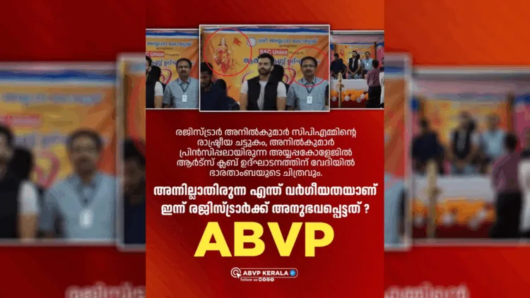 തിരുവനന്തപുരം: രജിസ്ട്രാർ അനിൽകുമാർ സിപിഎമ്മിന്റെ രാഷ്ട്രീയ ചട്ടുകമായി മാറിയെന്നും അനിൽകുമാർ പ്രിൻസിപ്പലായിരുന്ന അയ്യപ്പകോളേജിൽ ആർട്സ് ക്ലബ് ഉദ്ഘാടനത്തിന് വേദിയിൽ ഭാരതാംബയുടെ ചിത്രമുപയോഗിച്ചപ്പോൾ ഇല്ലാതിരുന്ന എന്ത് വർഗീയതയാണ് ഇന്ന് രജിസ്ട്രാർക്ക് അനുഭവപ്പെട്ടതെന്നും എബിവിപി സംസ്ഥാന സെക്രട്ടറി ഈ യു ഈശ്വരപ്രസാദ്. 2020 ൽ അനിൽകുമാർ പ്രിൻസിപ്പൽ ആയിരിക്കെ ധ്വനി കലാലയ യൂണിയൻ നടത്തിയ പരിപാടികളിൽ ഭാരതാംബയുടെ ചിത്രങ്ങൾ ഉപയോഗിച്ചിരുന്നു. അന്ന് പരിപാടിയുടെ ഉദ്ഘാടകൻ ആയിരുന്നു ഡോ കെ എസ് അനിൽകുമാർ.