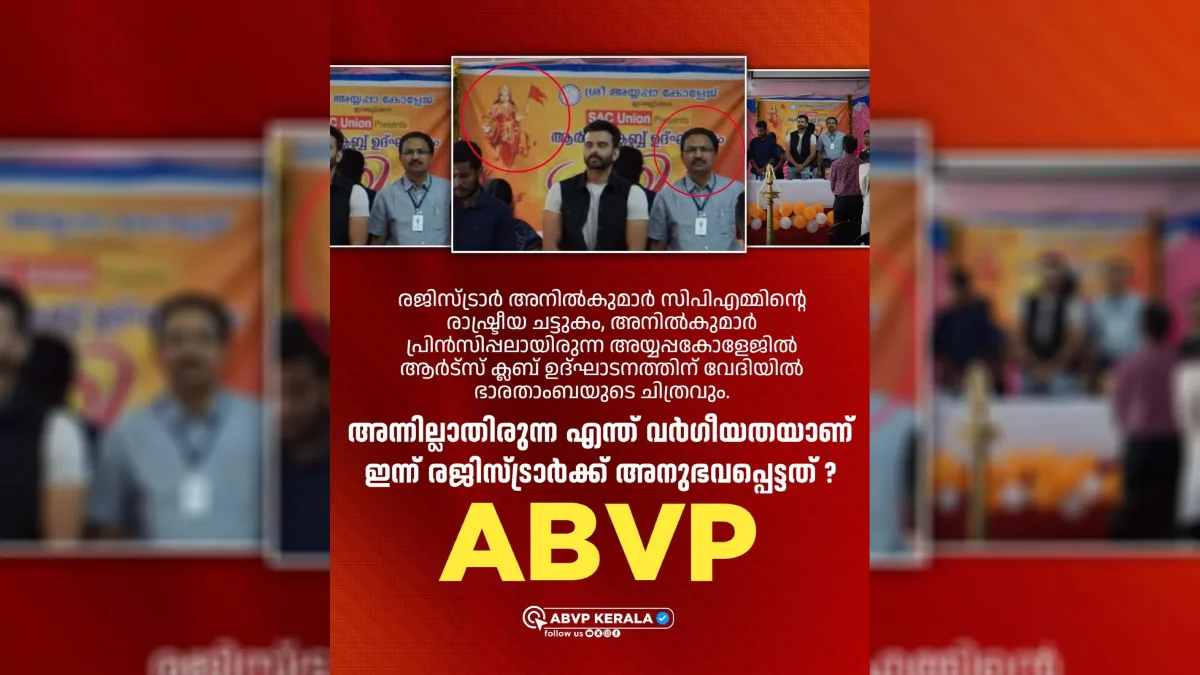 ഇന്ന് ചട്ടവിരുദ്ധമായി രജിസ്ട്രാർ ആയപ്പോൾ സിപിഎമ്മിന്റെ രാഷ്ട്രീയ ചട്ടുകമായി അദ്ദേഹം മാറി. സിപിഎം നേതാക്കൾ സെനറ്റ് ഹാളിന് പുറത്ത് പ്രശ്നം ഉണ്ടാക്കിയപ്പോൾ രജിസ്ട്രാർ ഹാളിനുള്ളിൽ പരിപാടി അലങ്കോലപ്പെടുത്താൻ ശ്രമിച്ചു. ഗവർണർ പങ്കെടുക്കുന്ന, പ്രോട്ടോകോൾ അനുസരിച്ച് നടത്തുന്ന പരിപാടിയിൽ തടസ്സം സൃഷ്ടിച്ച് ചാൻസിലറായ ഗവർണറോട് അനാദരവ് കാണിക്കുകയാണ് രജിസ്ട്രാർ കെ എസ് അനിൽകുമാർ ചെയ്തത്. ആലപ്പുഴ ശ്രീ അയ്യപ്പ കോളേജിൽ നടന്ന പരിപാടിയിൽ ഉണ്ടായിരുന്ന അതേ ഭാരതാംബയുടെ ചിത്രം തന്നെയാണ് സെനറ്റ് ഹാളിൽ ഉണ്ടായിരുന്നതും. യഥാർത്ഥത്തിൽ രജിസ്ട്രാറുടെ പ്രശ്നം ഭാരതാംബയല്ല സിപിഎമ്മിനോടുള്ള വിധേയത്വവും കൂറും ആണ്. രജിസ്ട്രാറുടെ ചട്ടവിരുദ്ധ നിയമനത്തിന് പ്രതിഫലമെന്നോണം ഇടതുപക്ഷത്തിന്റെ ചട്ടുകമായി പ്രവർത്തികയാണെന്നും അദ്ദേഹം പറഞ്ഞു