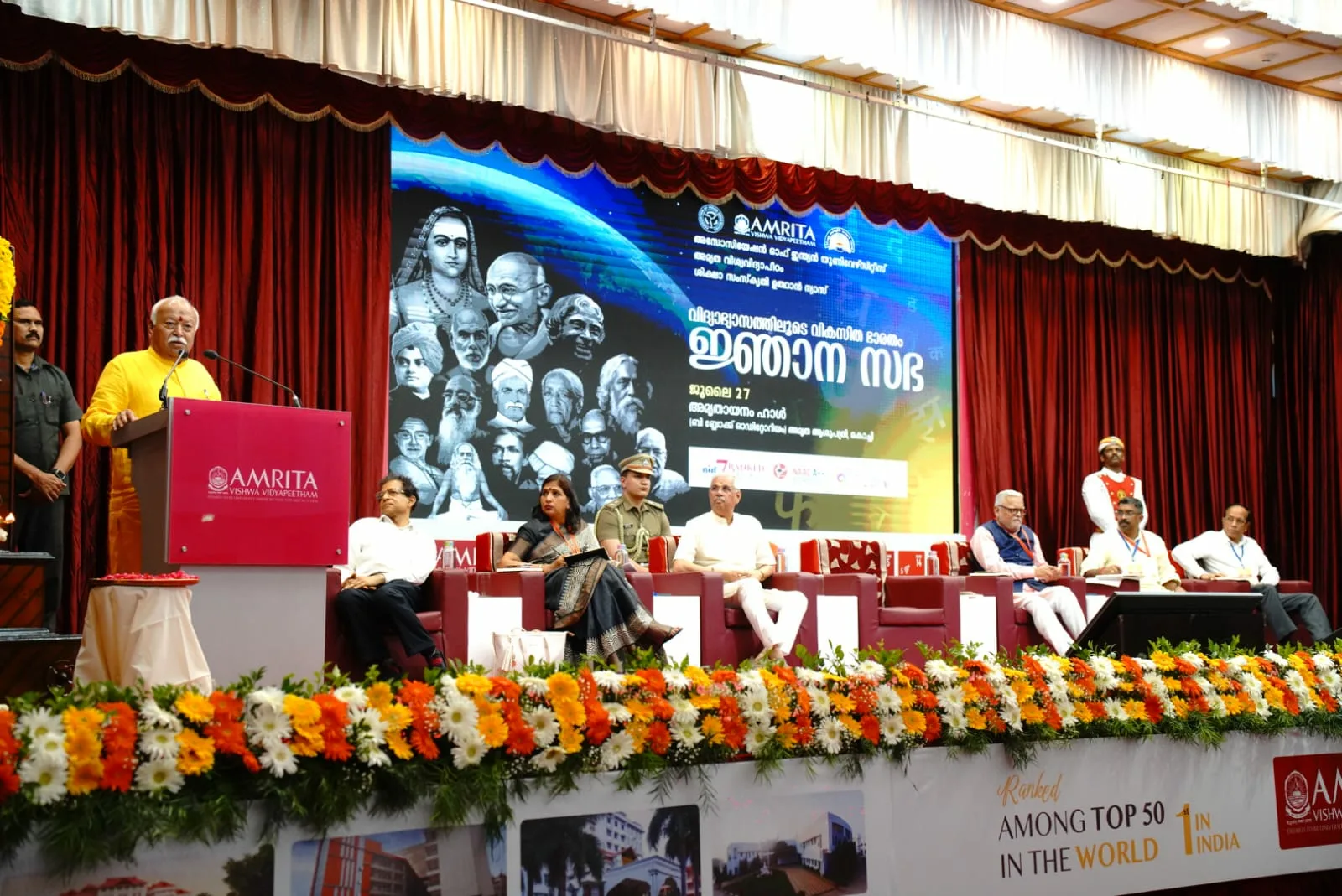 കൊച്ചി: വികസിത ഭാരതം എന്നതില് മുഴുവന് ലോകത്തിന്റെ ഏകതയെയാണ് ഉദ്ഘോഷിക്കുപ്പെടുന്നതെന്നും എല്ലാറ്റിലും ഈശ്വരീയതയെ ദര്ശിച്ച് വിശ്വമംഗളം ആഗ്രഹിച്ചാണ് ഭാരതം എക്കാലവും പ്രവര്ത്തിക്കുന്നതെന്നും ആര്എസ്എസ് സര്സംഘചാലക് ഡോ. മോഹന് ഭാഗവത്. ശിക്ഷ സംസ്കൃതി ഉത്ഥാന് ന്യാസിന്റെ ആഭിമുഖ്യത്തില് ഇടപ്പള്ളി അമൃത ആശുപത്രിയിലെ അമൃതായനം ഹാളില് ചേര്ന്ന ജ്ഞാനസഭയില് വിദ്യാഭ്യാസത്തിലെ ഭാരതീയത എന്ന വിഷയത്തില് മുഖ്യപ്രഭാഷണം നടത്തുകയായിരുന്നു അദ്ദേഹം.
