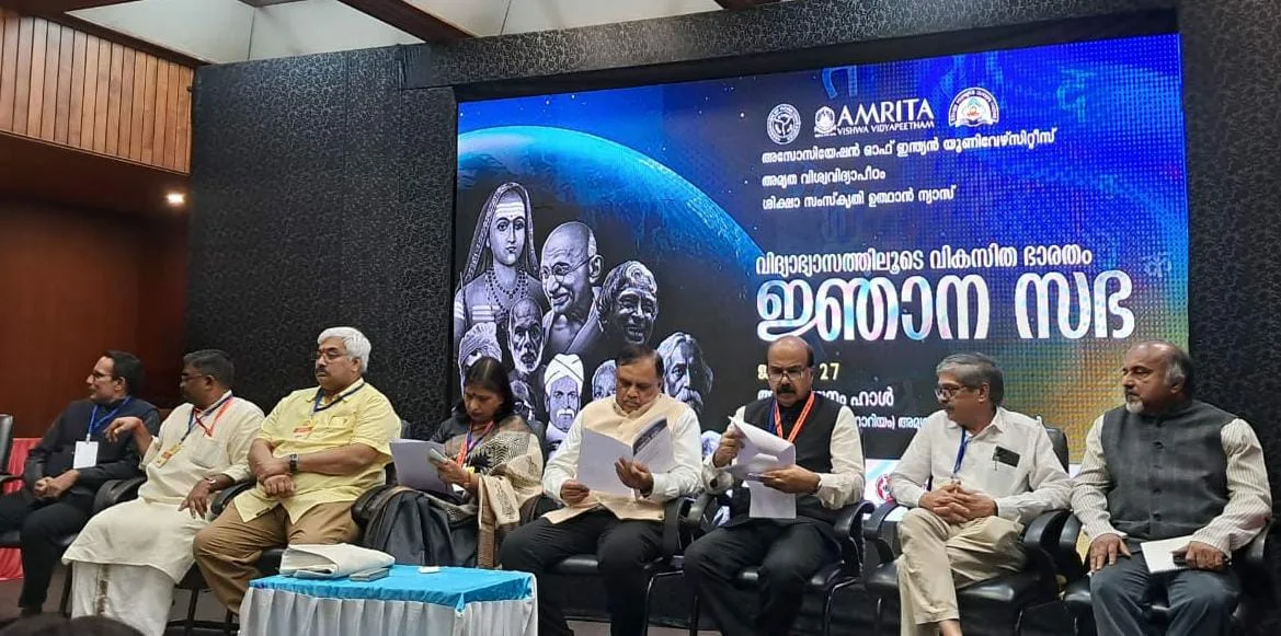 ലോക പ്രശസ്ത ശാസ്ത്രജ്ഞനായ ആല്ബര്ട്ട് ഐന്സ്റ്റിനെ വൈസ് ചാന്സലര് പദവിയിലേക്ക് ക്ഷണിക്കുവാന് തക്ക ആര്ജ്ജവമുള്ള കേരളീയ സമൂഹത്തെ ഒരുക്കിയതില് ശ്രീ ശങ്കരാചാര്യര്, ശ്രീനാരായണ ഗുരു തുടങ്ങിയ ഒട്ടേറെ ദാര്ശനികന്മാരുടെ പങ്കുണ്ട്. ഇന്ന് ഇവരെ കുറിച്ചെല്ലാം നാം ഉറച്ചു പറയുന്നു. അതുമൊരു പരിവര്ത്തനമാണ്. മാതാപിതാക്കളുടെ പാരമ്പര്യസ്വത്ത് പണയം വച്ച് ഉന്നത വിദ്യാഭ്യാസത്തിനായി പോകുന്ന അവസ്ഥ ഇന്ന് നമ്മുടെ നാട്ടിലെ വിദ്യാര്ത്ഥികള് നേരിടുന്നു. ഇന്നത്തെ വിദ്യാര്ത്ഥികള് വളരെ സാമര്ത്ഥ്യവും നൈപുണ്യവുമുള്ളവരാണ്. എന്നാല് ഒരു കൂട്ടം വിദ്യാര്ത്ഥികള്, മറ്റു ചിലരുടെ പ്രേരണയില് രാഷ്ട്രീയ സ്ഥാനങ്ങള്ക്ക് വേണ്ടി ഒന്ന് പൂര്ണ്ണമാക്കാതെ വിവിധ ഡിഗ്രി കോഴ്സുകളില് ചേര്ന്ന് സര്വലാശാലകളില് തുടരുന്നു. അദ്ദേഹം ചൂണ്ടിക്കാട്ടി. അസോസിയേഷന് ഓഫ് ഇന്ത്യന് യൂണിവേഴ്സിറ്റിസ് സെക്രട്ടറി ജനറല് ഡോ. പങ്കജ് മിത്തല്, ഭാരത സര്ക്കാരിന്റെ കീഴിലുള്ള എഐസിടിഇയുടെ ചെയര്മാന് പ്രൊഫ. ടി.ജി. സീതാറാം, കേന്ദ്ര വിദ്യാഭ്യാസ മന്ത്രാലയത്തിന്റെ കീഴിലുള്ള ഭാരതീയജ്ഞാനപരമ്പര നാഷ്ണല് കോ-ഓര്ഡിനേറ്റര് പ്രൊഫ. ഗാണ്ടി എസ.് മൂര്ത്തി കണ്ണൂര് സര്വകലാശാല വൈസ് ചാന്സലര് പ്രൊഫ. സാജു കെ.കെ, കുഫോസ് വൈസ് ചാന്സലര് പ്രൊഫ. എ. ബിജുകുമാര്, കാലിക്കറ്റ് സര്വകലാശാല വൈസ് ചാന്സലര് പ്രൊഫ. പി .രവീന്ദ്രന് എന്നിവര് പ്രസംഗിച്ചു. വിദ്യാഭ്യാസ സ്ഥാപനങ്ങളുടെ മേധാവികളും പ്രിന്സിപ്പാള്മാരും കോണ്ക്ലേവില് പങ്കെടുത്തു.