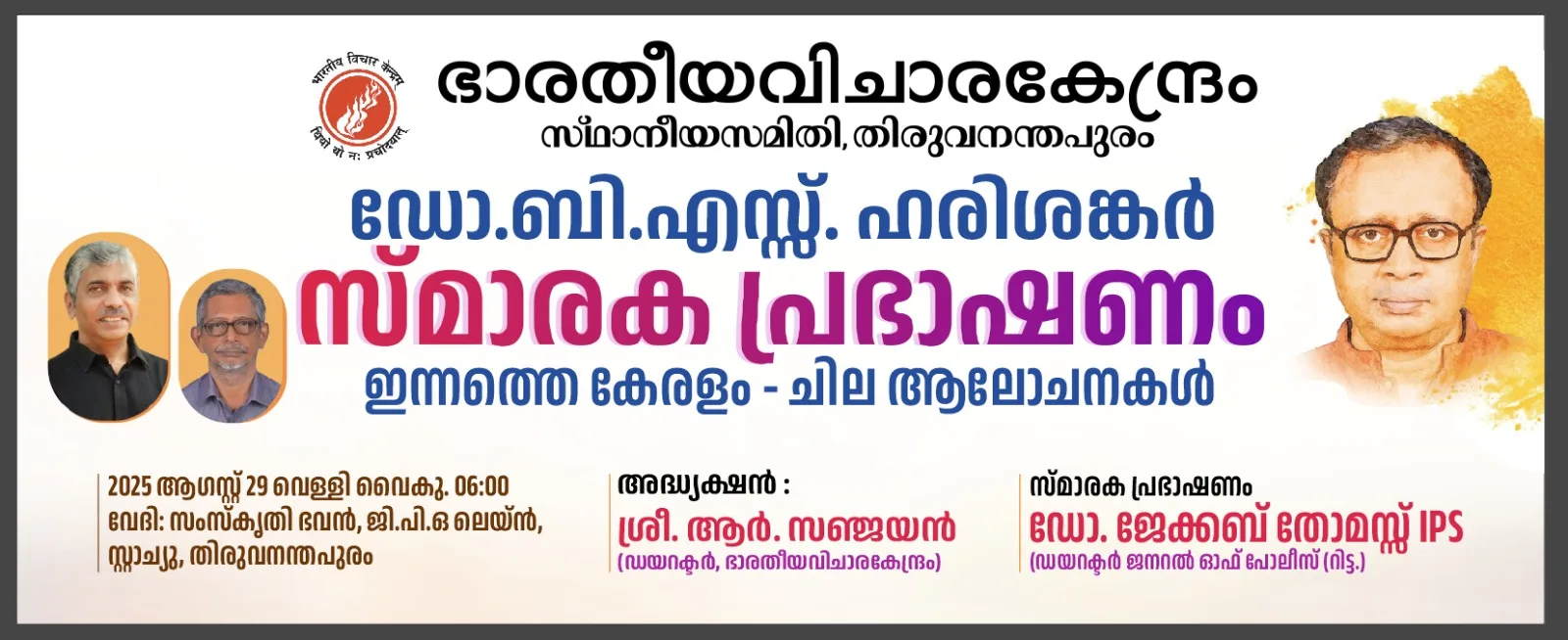 തിരുവനന്തപുരം: ഡോ. ബി. എസ്സ് ഹരിശങ്കർ സ്മാരക പ്രഭാഷണം ഇന്ന് വൈകിട്ട് 6 മണിക്ക് റിട്ടയേർഡ് ഡയറക്ടർ ജനറൽ ഓഫ് പോലീസ് ഡോ. ജേക്കബ് തോമസ്സ് തിരുവനന്തപുരം സംസ്കൃതി ഭവനിൽ നിർവഹിക്കും. ഭാരതീയവിചാരകേന്ദ്രത്തിൻ്റെ ആഭിമുഖ്യത്തിൽ സംഘടിപ്പിക്കുന്ന പരിപാടിയിൽ “ഇന്നത്തെ കേരളം – ചില ആലോചനകൾ” എന്ന വിഷയത്തിലാണ് പ്രഭാഷണം. ഭാരതീയവിചാരകേന്ദ്രം ഡയറക്ടർ ശ്രീ. ആർ.സഞ്ജയൻ അദ്ധ്യക്ഷത വഹിക്കും.