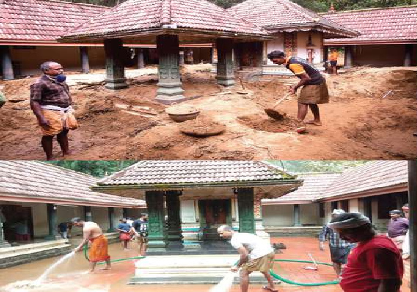 ശ്രീകോവിലിന് സമീപത്ത് നാലടിയോളം മണല് നിറഞ്ഞതോടെ ക്ഷേത്രം തുറക്കാനാവാത്ത അവസ്ഥയിലായിരുന്നു. എന്തു ചെയ്യണമെന്നറിയാതെ ഭക്തരും ക്ഷേത്രഭാരവാഹികളും വിഷമത്തിലായ ഘട്ടത്തിലാണ് സേവാഭാരതിയുടെ സഹായമെത്തിയത്. ഇതേത്തുടര്ന്ന് നൂറ് സേവാഭാരതി പ്രവര്ത്തകര് രണ്ട് ദിവസം നടത്തിയ പ്രയത്നത്തിനൊടുവിലാണ് ക്ഷേത്രം കഴുകി വൃത്തിയാക്കിയത്. ക്ഷേത്രത്തിന്റെ കിണര് മൂടിയ അവസ്ഥയിലാണ്. അടുത്ത ദിവസം സേവാഭാരതി പ്രവര്ത്തകര് കിണറും വൃത്തിയാക്കും.