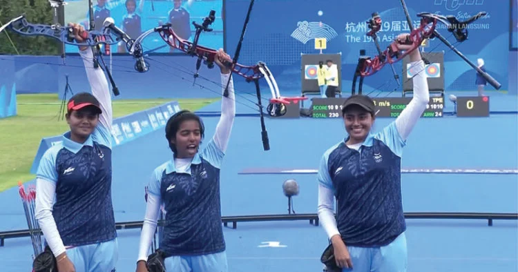 ഹാങ്ചൊ: ഏഷ്യൻ ഗെയിംസിൽ ഇന്ത്യയുടെ സ്വർണക്കൊയ്ത്ത് തുടരുന്നു. വനിതാ ടീം അമ്പെയ്ത്ത് മത്സരത്തിൽ സ്വർണം കൊയ്തതോടെ ഇന്ത്യയുടെ സ്വർണ മെഡലുകളുടെ എണ്ണം 19 ആയി. ജ്യോതി സുരേഖ, അദിതി ഗോപിചന്ദ് സ്വാമി, പർണീത് കൗർ എന്നിവർ അടങ്ങുന്ന സംഘമാണ് അമ്പെയ്ത്തിൽ ഭാരതത്തിനായി സ്വർണം എയ്തിട്ടത്. അമ്പെയ്ത്തിൽ ഇതു രണ്ടാമത്തെ സ്വർണമാണ് ഇന്ത്യ സ്വന്തമാക്കുന്നത്.