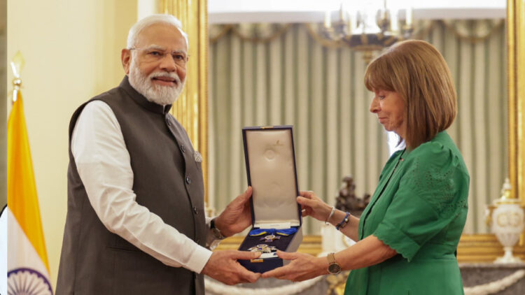 ഏഥന്സ്: ഗ്രീസ് പ്രസിഡന്റ് കാതറിന സകെല്ലരോപൗലോ പ്രധാനമന്ത്രി നരേന്ദ്ര മോദിക്ക് ‘ദി ഗ്രാന്ഡ് ക്രോസ് ഓഫ് ദി ഓര്ഡര് ഓഫ് ഓണര്’ നല്കി ആദരിച്ചു. 1975ലാണ് ഈ ബഹുമതി നല്കിത്തുടങ്ങിയത്. ബഹുമതിയായി സമ്മാനിക്കുന്ന നക്ഷത്രത്തിന്റെ മുന്വശത്ത് അഥീന ദേവിയുടെ ശിരസ്സ് ചിത്രീകരിച്ചിട്ടുണ്ട്. ‘നീതിപതികളെ മാത്രമേ ആദരിക്കാവൂ’ എന്ന് അതില് കുറിച്ചിട്ടുണ്ട്.