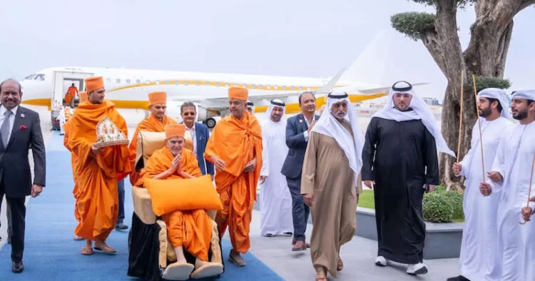 അബുദാബി അല് ബത്തീന് വിമാനത്താവളത്തില് സ്വാമി മഹാരാജിനെ യുഎഇ സഹിഷ്ണുതാ വകുപ്പ് മന്ത്രി ഷെയ്ഖ് നഹ്യാന് ബിന് മുബാറക് അല് നഹ്യാന്, അബുദാബി ചേംബര് വൈസ് ചെയര്മാനും ലുലു ഗ്രൂപ്പ് ചെയര്മാനുമായ എം.എ. യൂസഫലി, ഉന്നത സര്ക്കാര് ഉദ്യോഗസ്ഥര്, അബുദാബി ബാപ്സ് ക്ഷേത്രമേധാവി സ്വാമി ബ്രഹ്മവിഹാരിദാസ്, മറ്റ് ക്ഷേത്ര ഭാരവാഹികള് എന്നിവര് ചേര്ന്ന് സ്വീകരിച്ചു. യുഎഇയുടെ പരമ്പരാഗത വാദ്യഘോഷങ്ങളുടെയും നൃത്തത്തിന്റെയും അകമ്പടിയോടെയായിരുന്നു സ്വീകരണം.