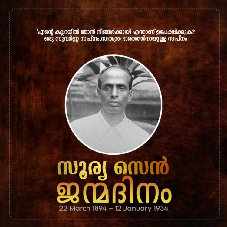സ്വജീവിതം ഭാരതമാതാവിന്റെ മോചനത്തിനായി അർപ്പണം നടത്തിയ സൂര്യ സെന്നിന്റെ ഓർമ്മകൾക്ക് ശതകോടി പ്രണാമങ്ങൾ
