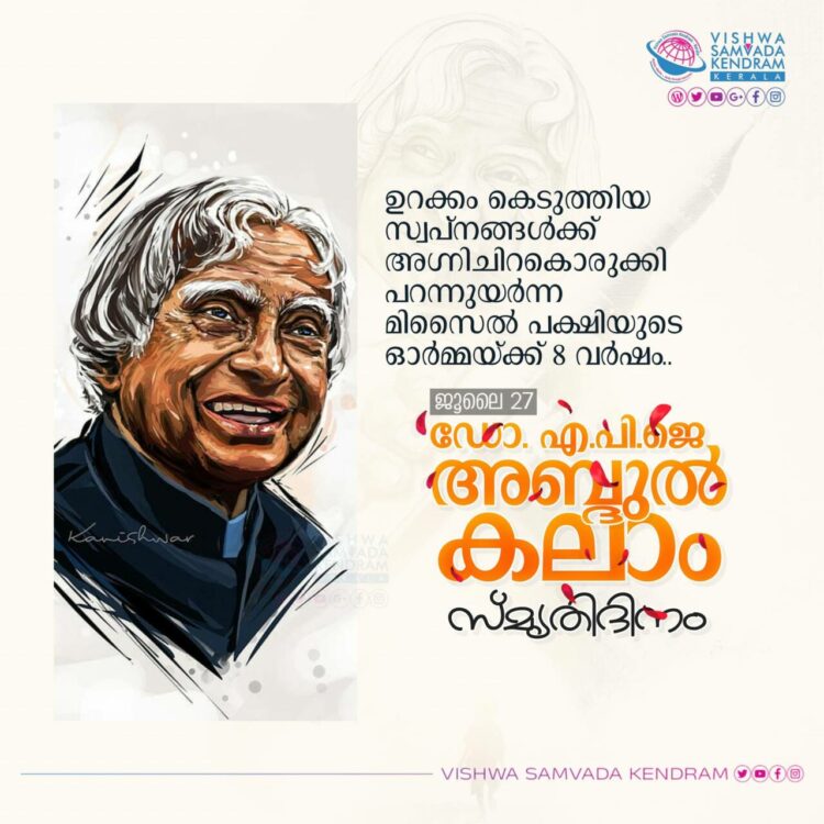ഭാരതത്തെ അഗാധമായി സ്നേഹിച്ച ഡോ. എ.പി.ജെ അബ്ദുൽ കലാം ഭാരതത്തെ സ്നേഹിക്കുന്നവർ ഉള്ളിടത്തോളം അമരനാണ് അനശ്വരനാണ്. ഈ രാഷ്ട്രവും അതിന്റെ സംസ്കൃതിയും നിലനിൽക്കുന്നിടത്തോളം അദ്ദേഹം മുറുകെപ്പിടിച്ച ജീവിതാദർശത്തിന് ലോഭമുണ്ടാകില്ല എന്ന് ചുരുക്കം. തമിഴ്നാട് രാമേശ്വരത്തെ ഒരു സാധാരണ കുടുംബത്തിൽ നിന്നും ലോകം അറിയുന്ന ലോകം ആദരിക്കുന്ന നിലയിലേക്ക് അദ്ദേഹം ഉയർന്നത് ദേശസ്നേഹവും ലാളിത്യവും അനുഭവസമ്പത്തും മുറുകെപ്പിടിച്ചുകൊണ്ടുള്ള ആദർശ ജീവിതം കൈമുതലാക്കികൊണ്ടായിരുന്നു. ശാസ്ത്രജ്ഞനായും രാഷ്ട്രപതിയായും രാജ്യത്തിന് വലിയ സംഭാവനകൾ നൽകിയ അദ്ദേഹം തന്റെ ജീവിതത്തെ ഏതൊരു ഭാരതീയനും എക്കാലവും പിന്തുടരാവുന്ന ഉദാത്ത മാതൃകയാക്കി ബാക്കിവച്ചാണ് എട്ടാണ്ട് മുൻപ് ഭൗതികമായി മാത്രം വിടവാങ്ങിയത്. ആ മഹാമനുഷ്യൻ സ്വജീവിതം കൊണ്ട് രാജ്യത്തിന്റെയും സമാജത്തിന്റെയും നല്ല ഭാവിക്ക് നൽകിയ അഗ്നിച്ചിറകുകൾ ഈ രാഷ്ട്രത്തിനും രാഷ്ട്രഭക്ത സമൂഹത്തിനും എല്ലാ കാലത്തും വലിയ കരുത്തായിരിക്കും.