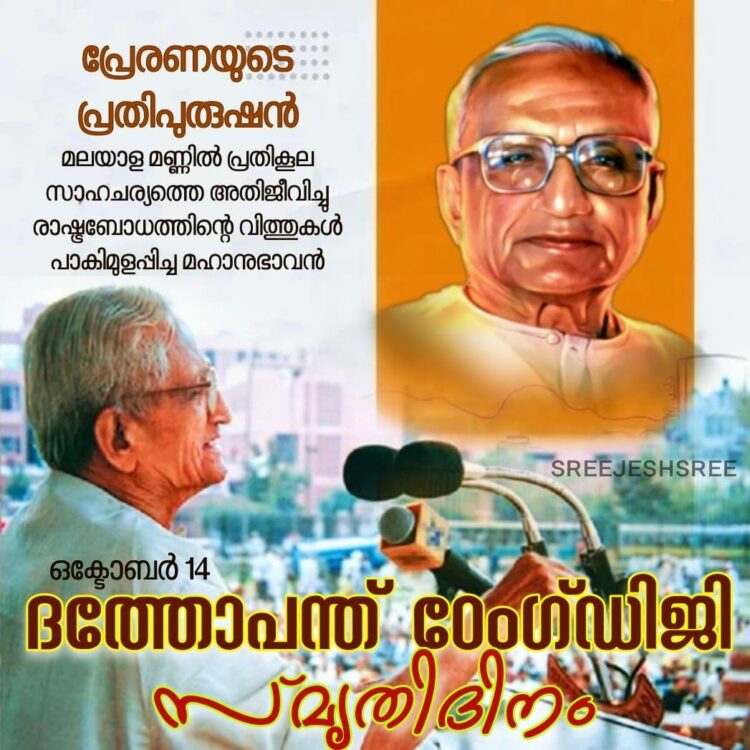 ഠേംഗ്ഡിജിയെ സ്മരിക്കുമ്പോള്, നമുക്ക് എന്നും മാതൃകയാക്കാന് കഴിയുന്ന സംഘാടകന്, വാഗ്മി, ചിന്തകന് എല്ലാത്തിലും ഉപരി മനുഷ്യസ്നേഹിയായ തൊഴിലാളി പ്രവര്ത്തകന്, ലളിത ജീവിതം നയിക്കുമ്പോഴും ഉയര്ന്ന ചിന്തയും ദീര്ഘദര്ശിത്വവും ഒത്തിണങ്ങിയ ഋഷിവര്യന് തുടങ്ങിയ സവിശേഷതകളാണ് ഓര്മ്മിക്കപ്പെടുക. രാഷ്ട്ര പുനര്നിര്മ്മാണത്തിനായി സമ്പൂര്ണ്ണമായി സമര്പ്പിക്കപ്പെട്ട ജീവിതമായിരുന്നു അദ്ദേഹത്തിന്റേത്. 1920 ല് മഹാരാഷ്ട്രയിലെ വാര്ധ ജില്ലയില് ആര്വ്വി നഗരത്തില് ദത്താത്രേയ ബാപ്പുറാവു എന്ന ദതോപന്ത് ഠേംഗ്ഡിജി ജനിച്ചു. അമ്മ ജാനകിഭായിക്കും അച്ഛന് ബാപ്പുറവ് ദജീബാ ഠേംഗ്ഡിക്കും ഒരു വരദാനമായി ലഭിച്ച ജന്മമായിരുന്നു അദ്ദേഹത്തിന്റെത്.