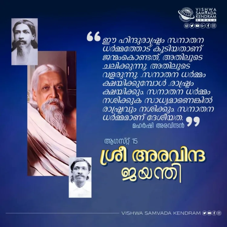 ഭാരതം നിലനിൽക്കണമെങ്കിൽ അവൾ യുവത്വം നേടണം. ശക്തിയുടെ ഇരമ്പിയാർക്കുന്ന വൻ പ്രവാഹങ്ങൾ അവളിലേക്ക് കൂടിച്ചേരണം . അപാരവും അതിഭീമമായ വേലിയേറ്റങ്ങളോട് കൂടിയും അതേ സമയം ഇച്ഛാനുസരണം പ്രശാന്തമോ പ്രചണ്ഡമോ ആവാനുള്ള കഴിവോട് കൂടിയും ഉള്ള കർമ്മശക്തിയുടെ വാരിധിയാവണം അവളുടെ ആത്മാവ് ”( അരവിന്ദ ഘോഷ് )എന്റെ ജന്മദിനത്തിന്റെയന്ന് എന്റെ മാതൃഭൂമി സ്വതന്ത്രയാകുമെന്ന് പ്രവചിച്ച ഭാവിയുടെ ദാർശനികൻ .(1872 ഓഗസ്റ്റ് 15 ന് ബംഗാളിൽ ആണ് മഹർഷി അരവിന്ദന്റെ ജന്മദിനം അദ്ദേഹത്തിന്റെ 151-ാം ജന്മദിനമാണ് ഇന്ന്)ആ അനുഗൃഹീത തൂലികയിൽ നിന്നുയർന്ന വിപ്ലവത്തിന്റെ സന്ദേശങ്ങൾ ഭാരതീയ യുവത്വത്തെ തൊട്ടുണർത്തി. യുഗാന്തറും വന്ദേമാതരവും അത്തരം സന്ദേശങ്ങളാൽ തീഷ്ണമായി . ഉണർന്നുയർന്ന സ്വാതന്ത്ര്യ ജ്വാലകൾ ബ്രിട്ടീഷ് സാമ്രാജ്യത്വത്തിന്റെ മുട്ടുവിറപ്പിക്കുന്നത് കണ്ട് ഏവരും അത്ഭുതപ്പെട്ടു..
