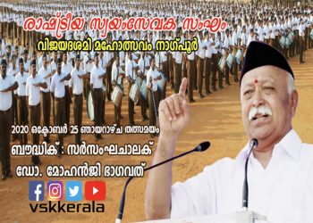 രാഷ്ട്രീയ സ്വയംസേവക സംഘത്തിന്റെ വിജയദശമിയോടനുബന്ധിച്ചുള്ള പ്രാന്തസാംഘിക് നാളെ നടക്കും. കോവിഡ് നിയന്ത്രണങ്ങളുടെ പശ്ചാത്തലത്തില് അഞ്ച് സ്വയംസേവകര് വീതം വീടുകളില് ഒരുമിച്ചു ചേര്ന്നാണ് പ്രാന്തസാംഘിക്കില് പങ്കുകൊള്ളുക. രാവിലെ 7.45ന് ...
