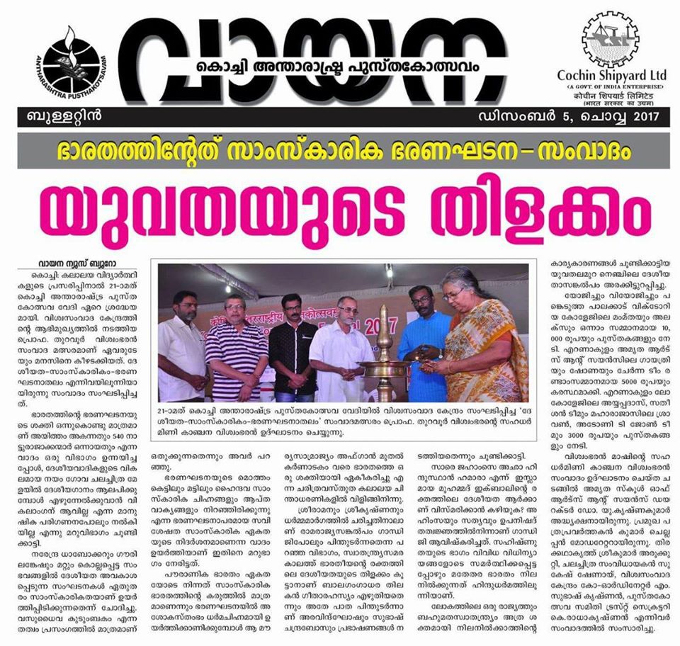 Debate Competition for Collage Students in the Name of Thuravur Viswambharan Mash (The Founder President of Vishwa Samvada Kendram, Kerala) was conducted at the venue of 21st Kochi International Book Fest, December 04, 2017. The subject for the debate is Nationalism- Cultural?/Constitutional?